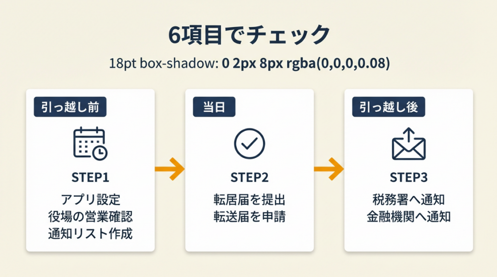 - 【注意点】: 「引っ越し当日の朝に確認する」だけでは不十分です。役場と郵便局の営業時間外になると当日手続きができなくなるため、前日夜にリストを再確認してください。