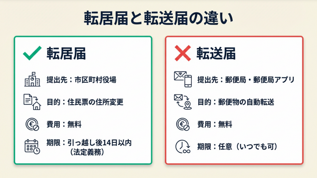 というユーザーの報告があります(Yahoo知恵袋・転居届と転送届の違いに関する質問)。