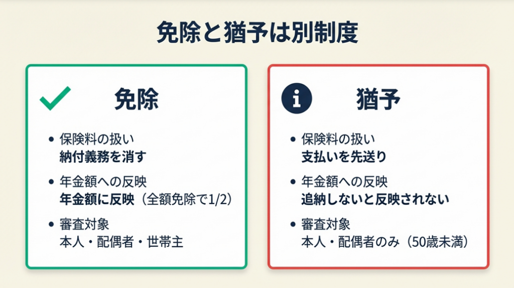 国民年金の「免除」と「猶予」は別制度です。免除は将来の年金額に一定割合(全額免除で1/2)反映されますが、猶予は追納しない限り年金額に反映されません。日本年金機構「国民年金保険料の免除制度・納付猶予制度」に基づき、免除・猶予・未納の3択を比較し、申請手順と追納戦略を解説します。本記事の情報は2026年3月時点のものです。
