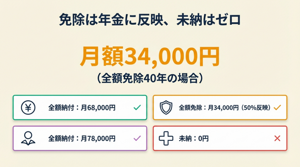 これは確かに全額納付に比べて少ない金額です。しかし「未納で年金がゼロ円」になるリスクと比較すれば、全額免除でも年金が受け取れる状態は明らかに有利です。