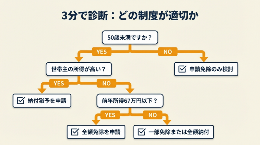 「免除が有利」と分かっても、自分の状況ではどれを選ぶべきか迷う方も多いはずです。以下の診断で目安を確認してください。
