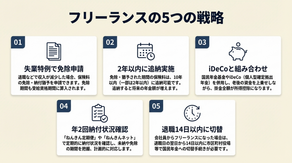 - 【コツ】: 「免除で保険料支出をゼロにしながら、iDeCoで自分の年金を上乗せする」ことでトータルの老後資金を充実させられます。節税全般の観点ではフリーランスの節税対策も参考にしてください。