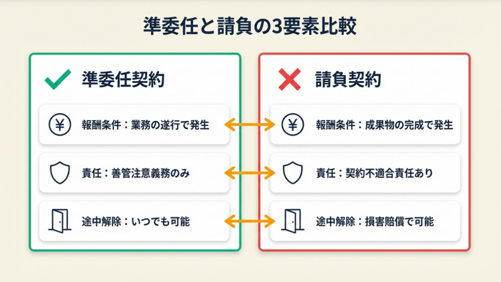 準委任契約と請負契約の最大の違いは「報酬の発生条件」です。準委任契約は業務を遂行した段階で報酬が発生しますが、請負契約は成果物を完成・納品しなければ原則として報酬を請求できません。フリーランスにとっては契約形態の選択がリスク管理の出発点であり、成果物が明確なプロジェクトには請負契約、継続的な開発支援や運用保守には準委任契約が適しています。