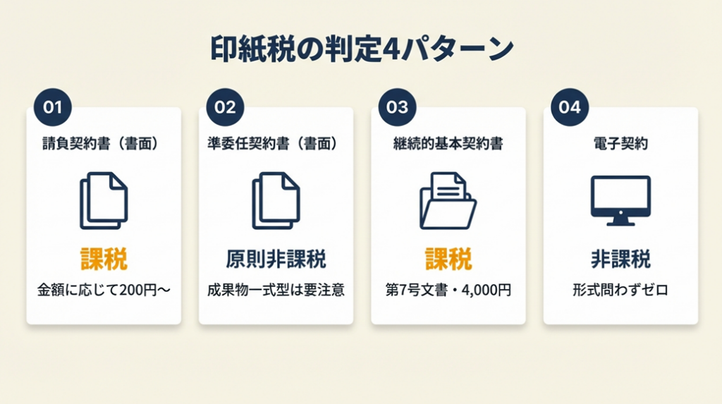 | 準委任契約書(書面) | 原則非課税 | 成果物一式型は要注意 |