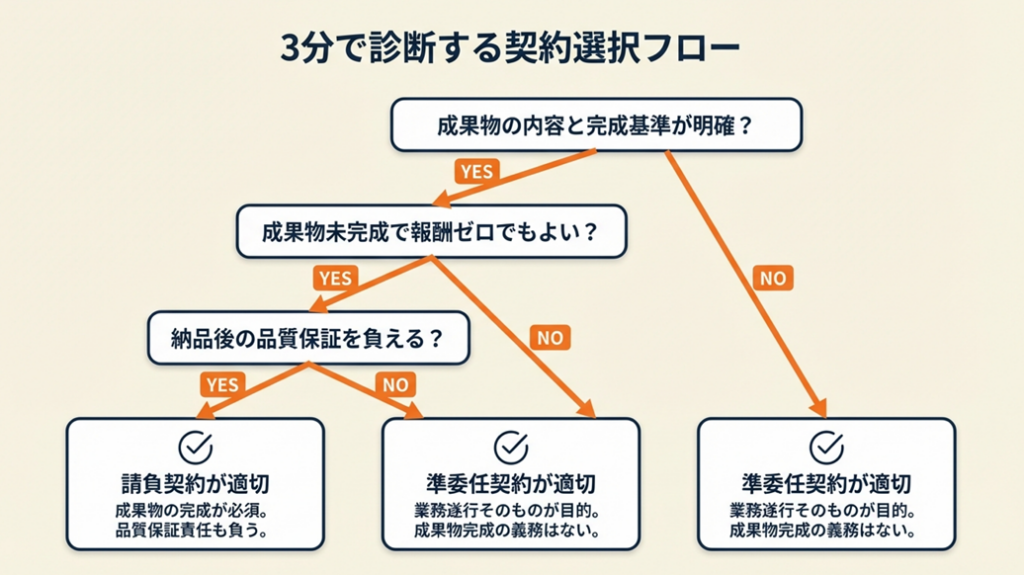 - Yes → 「請負契約」が適しています(完成義務と契約不適合責任を受け入れられるプロジェクト)