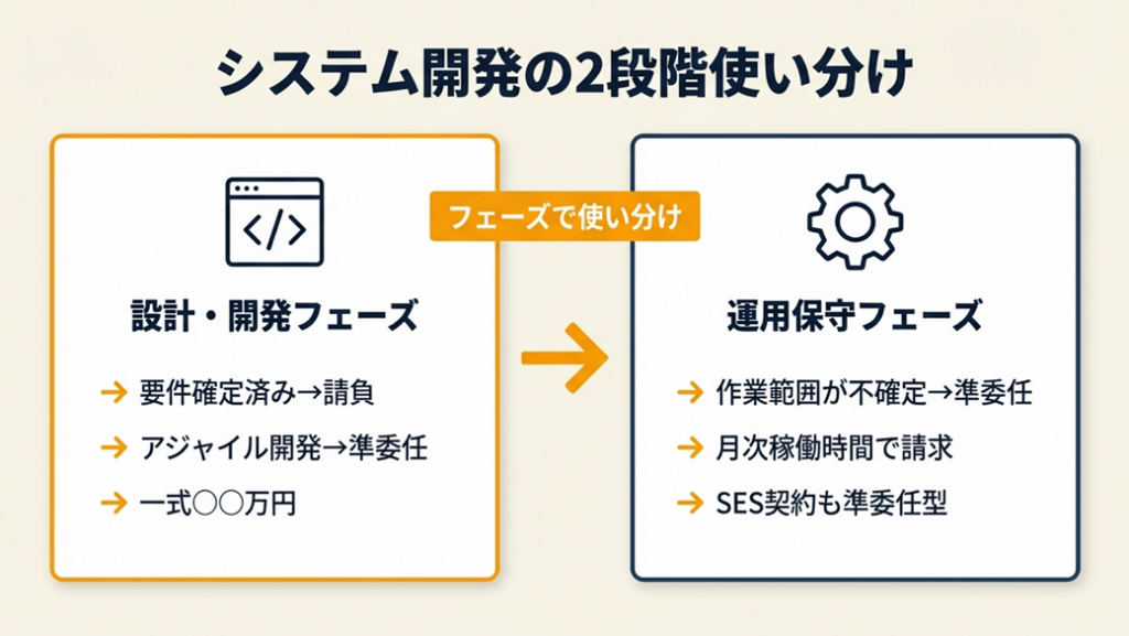 IT・Web系のフリーランスにとって、システム開発でどちらの契約を選ぶべきかは特に重要な判断です。一般論では「両方とも使う」とされていますが、実際には「どのフェーズで」「どの性質のプロジェクトで」使うかで実務上の判断が異なります。