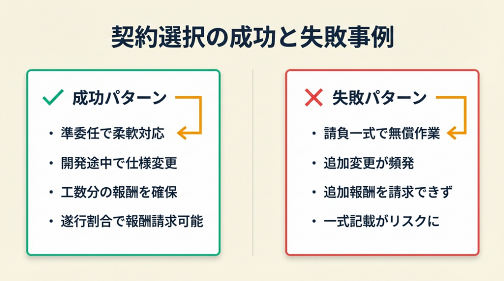 どちらの契約形態が正解かはプロジェクトの性質によって異なります。大切なのは「何が起きたときに誰がどのリスクを負うか」を契約前に双方が理解した上で合意することです。書面による合意の積み重ねが、フリーランスとしての信頼と収入の安定を支えます。