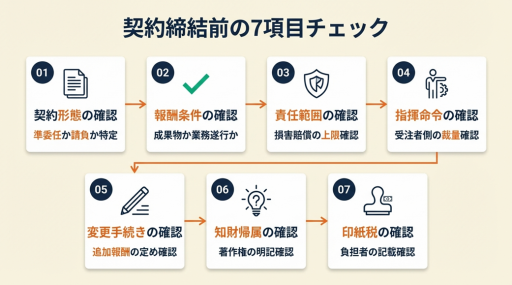 「契約書を渡されたが何を確認すればよいかわからない」という状況でも、この7項目を確認するだけでリスクの8割を把握できます。