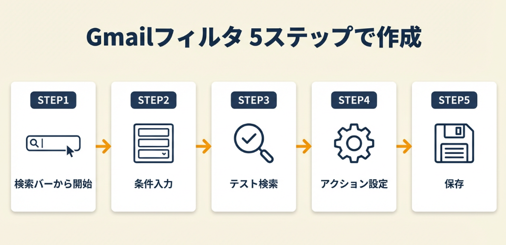 Gmailフィルタは検索バーの矢印アイコンから作成開始し、条件入力後のテスト検索で動作確認できます。スマホアプリでは一部のフィルタ作成機能に制限があるため、PCブラウザ版の利用が推奨されます。この記事では基本手順から複数条件の組み合わせ、動作確認までを5ステップで解説しています。