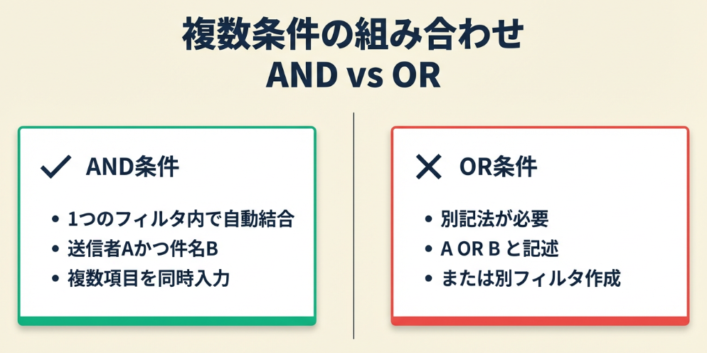 複数条件の組み合わせにはANDの自動結合とOR記法の2つのルールがあります。テスト検索で動作確認することが精度向上のポイントです。この記事で紹介した手順とハックを組み合わせれば、メール整理の時間を大幅に削減できます。