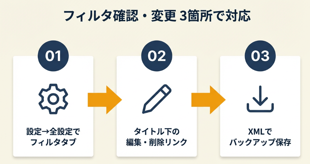 設定済みのフィルタの確認・変更には、3つの手順で対応できます。