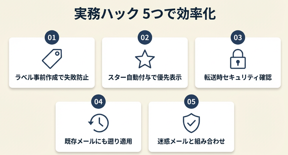 【なぜ効くのか】新規フィルタは「作成後のメールのみ」に適用される仕組みです。既存メールに遡り適用するオプションを使用すると、手動整理の負担が大幅に軽減されます。