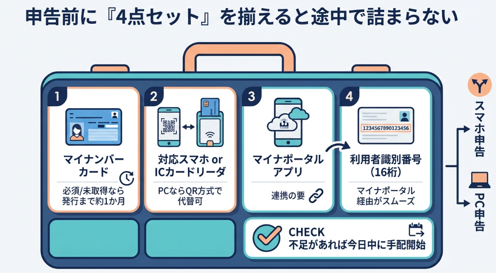 「何を準備すればいいかわからない」という悩みは珍しくありません。マイナンバーカード方式でe-Tax確定申告を行うには、以下の4点を事前に揃えておく必要があります。