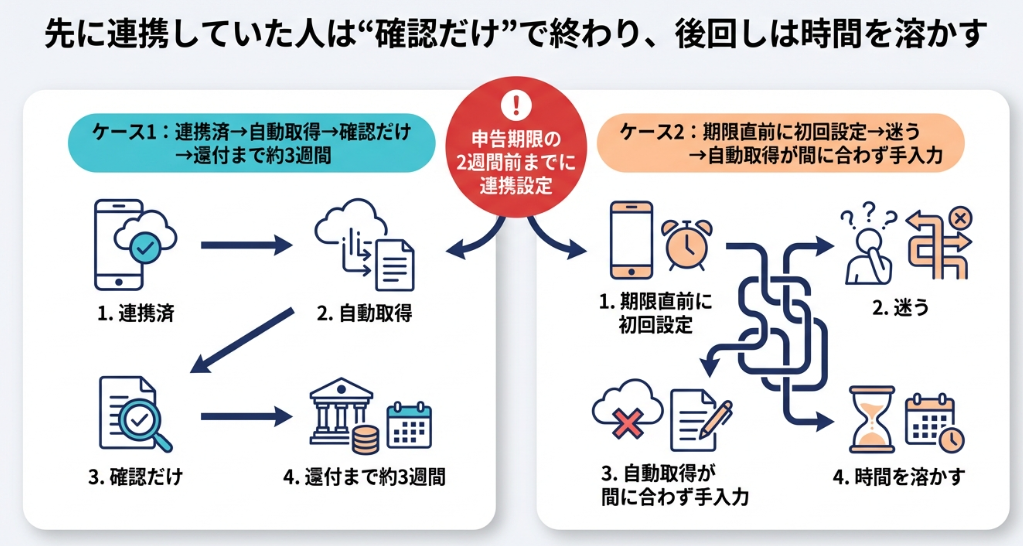 分岐点: マイナポータル連携を使わなければ、控除証明書を1件ずつ手入力する必要があり、作業時間が2〜3倍になっていた可能性があります。