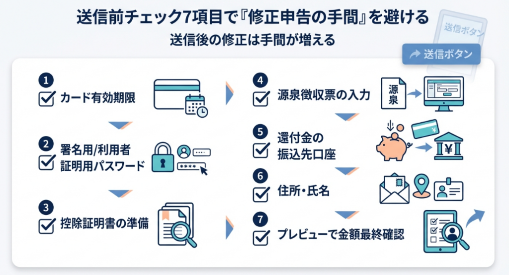 【コツ】送信前に5分間のプレビュー確認をすることです。一度送信すると修正申告が必要になり、手間が大幅に増えます。