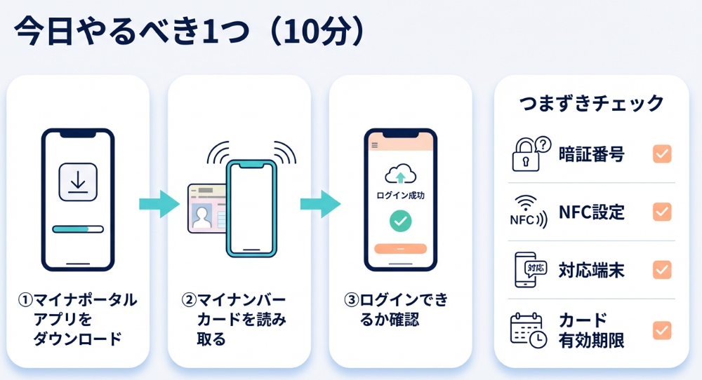 マイナポータルアプリをスマートフォンにダウンロードし、マイナンバーカードを読み取ってログインできるか確認する(10分)。