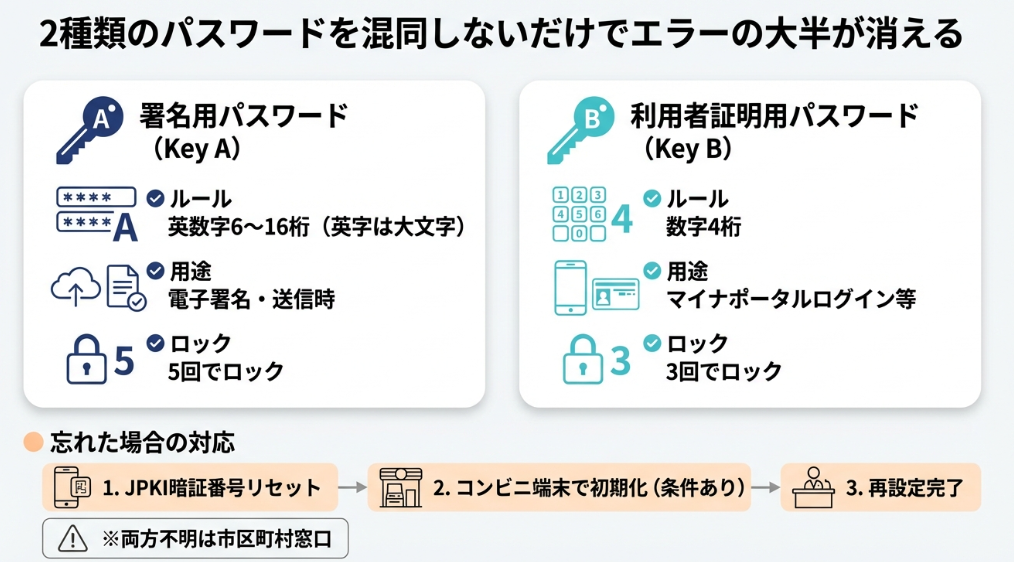 一方のパスワードがわかっている場合のみコンビニでの初期化が可能です。両方のパスワードを忘れた場合は、住民票のある市区町村の窓口で手続きが必要です(税理士ブログ)。