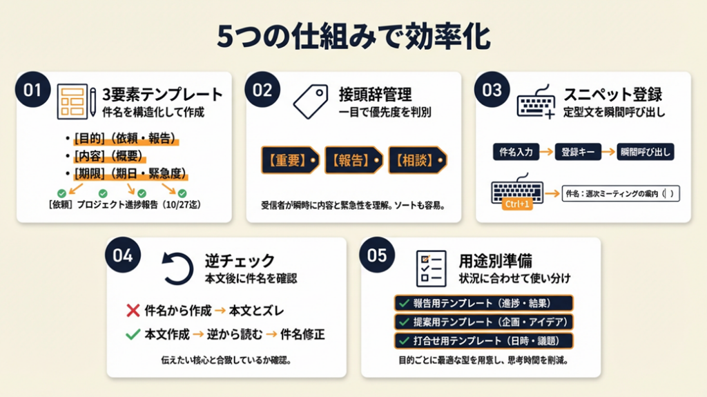 件名の書き方を知っていても、毎回ゼロから作っていては時間のロスです。ここでは件名作成を仕組み化し、作業時間を削減しながら返信率を高める5つの実務テクニックを紹介します。