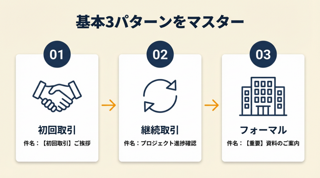 場面は主に5つに分類できます。それぞれのパターンを理解しておけば、どんな状況でも件名を即座に作れます。