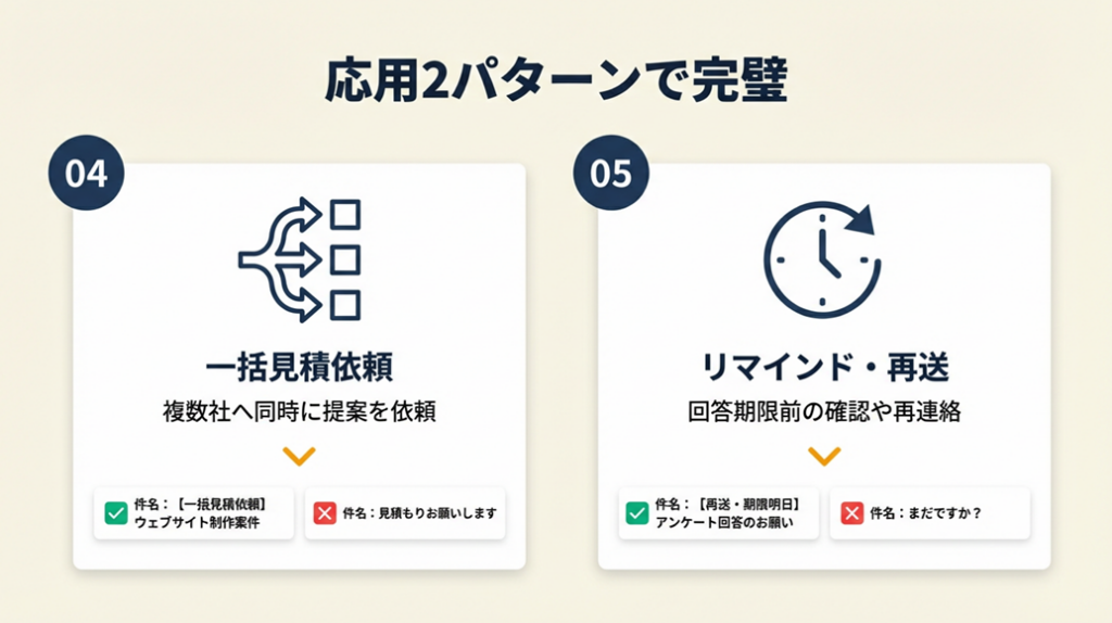 アレンジ例:案件番号を管理している場合は「見積依頼 No.024|追加バナー3点|○○株式会社様」のように番号を入れると管理が一層明確になります。