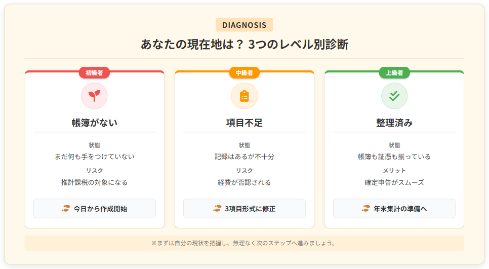 帳簿がなければ、税務調査で取引実態を説明できず、推計課税の対象になります。今から週1回30分の記帳習慣を作れば、確定申告時に慌てることはありません。