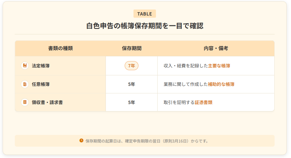 領収書・請求書などの証憑書類は5年間の保存義務があります。法定帳簿(収入・経費を記録した帳簿)は7年間です。保存期間の起算日は確定申告期限の翌日(原則3月16日)となります。