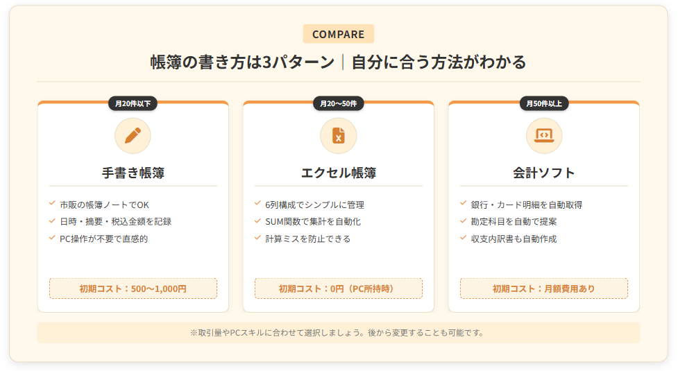 帳簿は、手書き・エクセル・会計ソフトの3パターンから選べます。取引量が月20件以下なら手書き、20〜50件ならエクセル、50件以上なら会計ソフトが目安です。