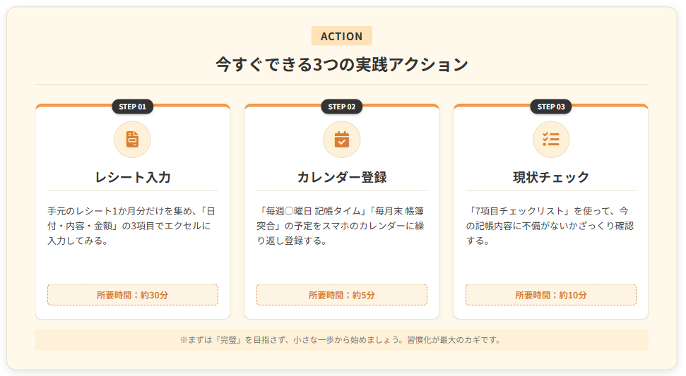 【最初の一歩】 今日中にカレンダーアプリで「毎月末 帳簿突合」の予定を登録し、今月分を試しに突合してください(30分)。