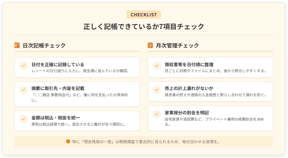 月末に7項目を確認し、すべてにチェックが入る状態を目指します。特に「現金残高と帳簿残高の一致」は、税務調査で最も重点的に確認される項目です。