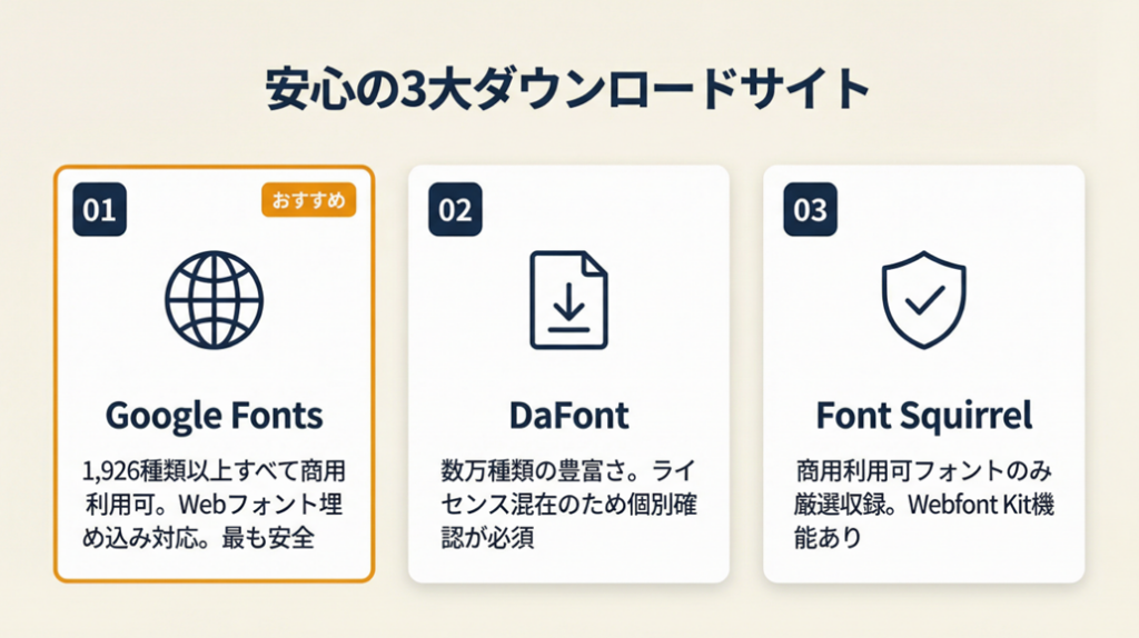 ダウンロードサイトを誤ると、マルウェアが混入したフォントファイルを取得するリスクがあります。信頼できる3サイトに絞って利用することが推奨されます。