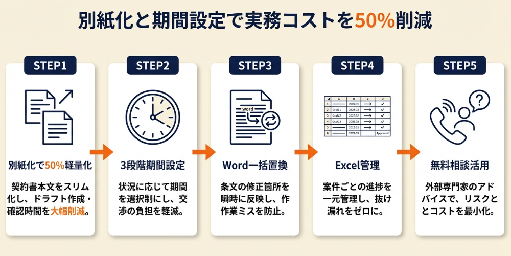 初めてNDA作成する方 → ハック1(別紙化)+ハック5(無料相談)の組み合わせです。テンプレートを軽量化した上で無料の専門家チェックを受けられます。
