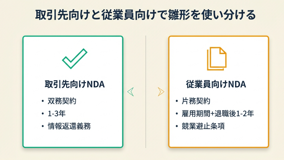 従業員向けと取引先向けを間違えると、必要な条項が欠落してトラブル時に契約が機能しません。ここでは両者の違いと選び方を整理します。