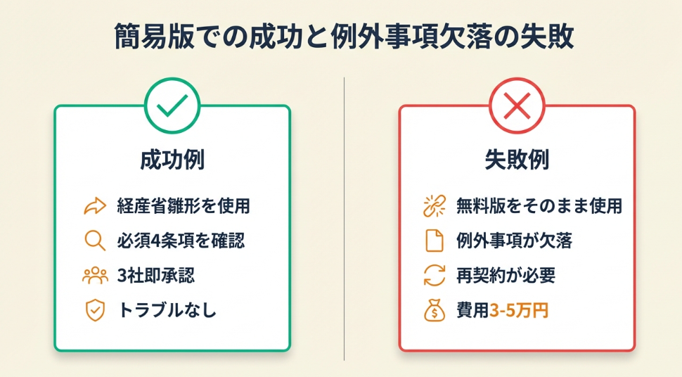 分岐点: 契約前に必須4条項をチェックリストで確認していれば、例外事項の欠落に気づき、再契約の手間とコスト(弁護士費用3-5万円)を回避できたはずです。