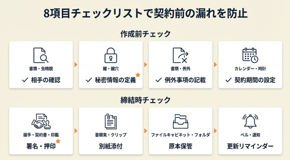 契約締結前に「秘密の定義」「例外事項」「期間」「ペナルティ」の4条項チェックリストで確認してください。後半の8項目チェックリストを使えば5分で漏れを防げます。