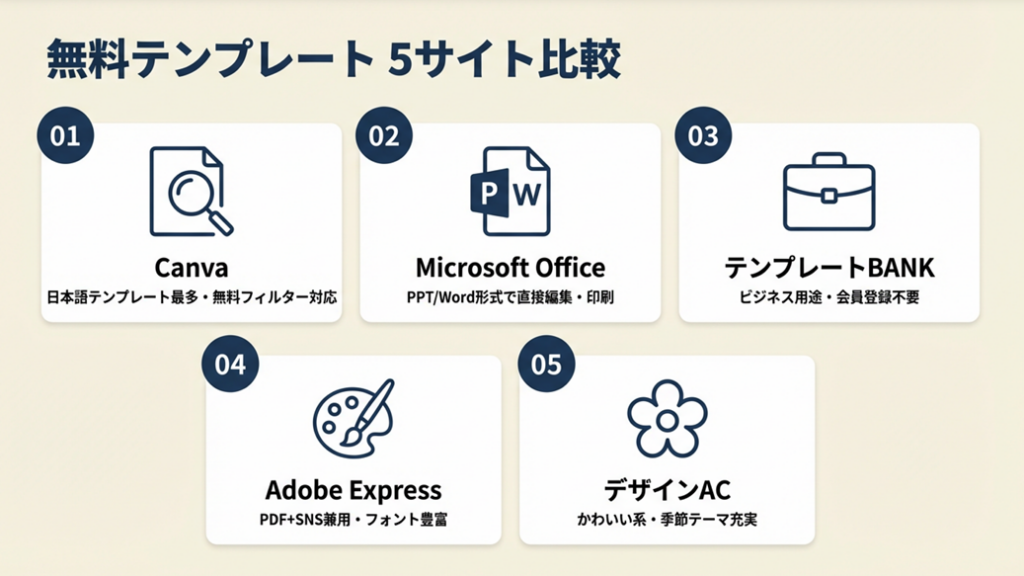 -> 上記5サイトを開き、目的のキーワードで検索して「無料」フィルターをかけたテンプレートを1つ選ぶ(5分)