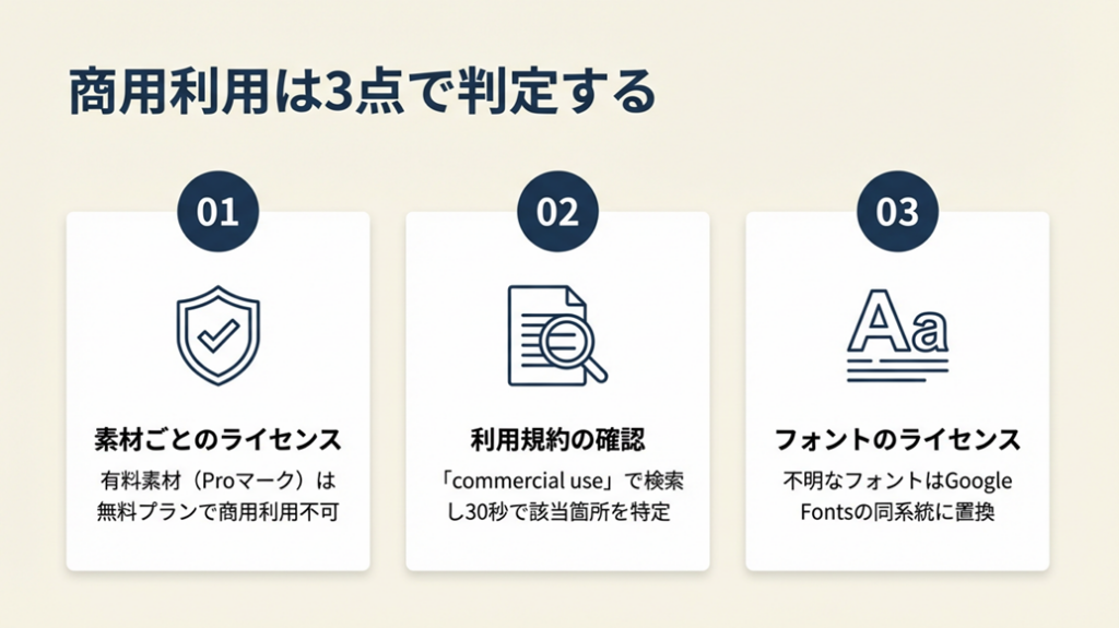 確認ポイントを3つに絞れば、商用利用可否の判断を迷わず進められます。あいまいなまま使うと、後から素材の差し替えが必要になるケースが約30%のフリーランスで発生します(利用規約トラブル経験者調査)。