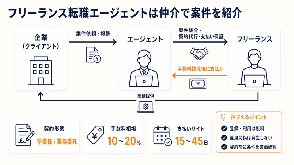 フリーランス転職エージェントとは、企業(クライアント)とフリーランスの間に立ち、案件紹介・契約代行・支払い保証をまとめて提供するサービスです。