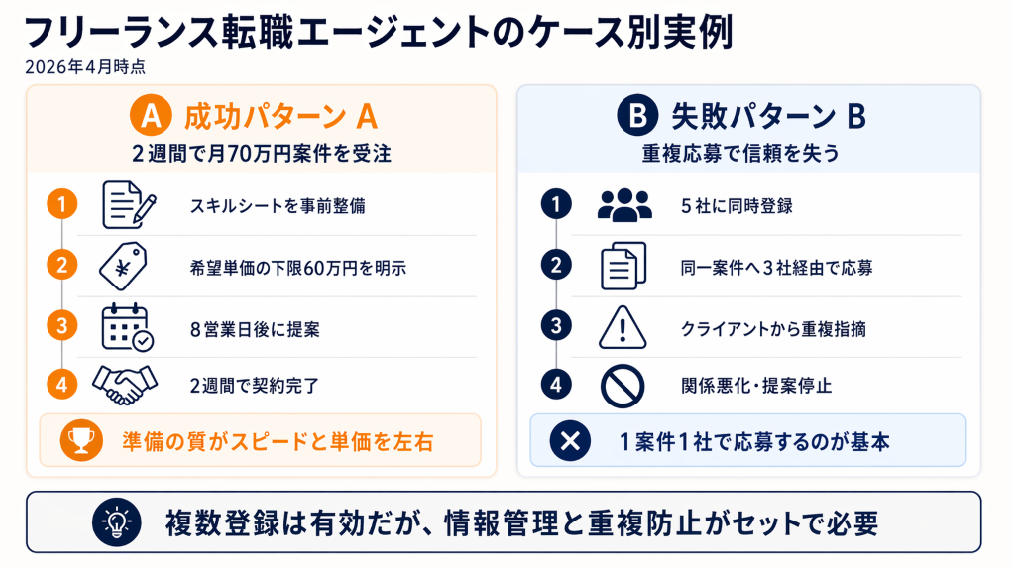 エージェント活用の明暗を分けるポイントは、登録前の事前準備と複数社管理の精度にあります。以下の2つの事例で、具体的な違いを確認してください。