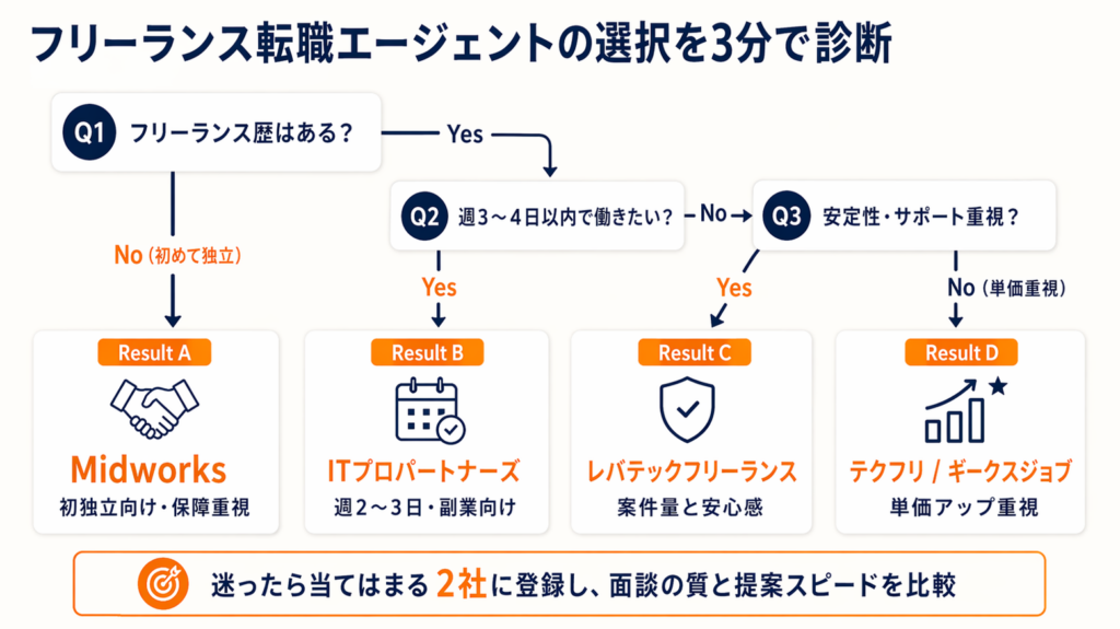 以下の分岐で自分の優先事項を整理してください。「自分に適したフリーランスエージェントはどこか?」を3分で判定できます。
