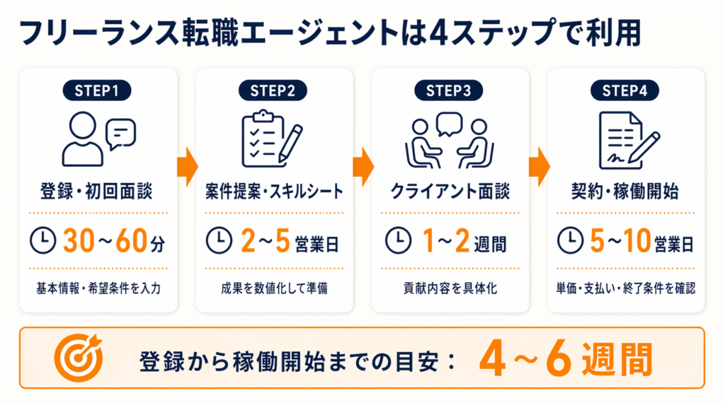エージェント利用は「登録 → 面談 → 案件提案 → 契約」の4ステップで完結します。流れを把握しておくことで、登録後の行動が明確になります。