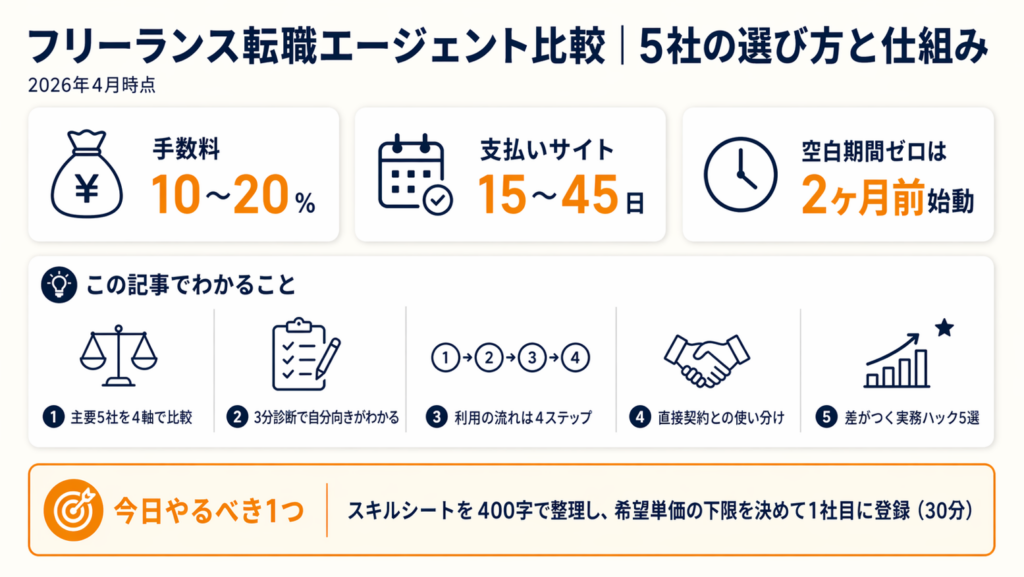 エージェント選びで悩む時間よりも、スキルシートを磨く30分の方が結果に直結します。今日できる一歩を一つだけ選んで実行することが、案件受注への近道です。フリーランスを始めるにあたっての全体的な準備については、フリーランスの始め方まるわかりガイドも参照してください。