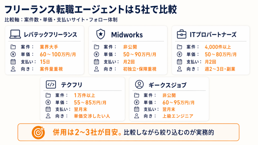 注記:各エージェントの案件数・単価相場は時期や検索条件によって変動します。