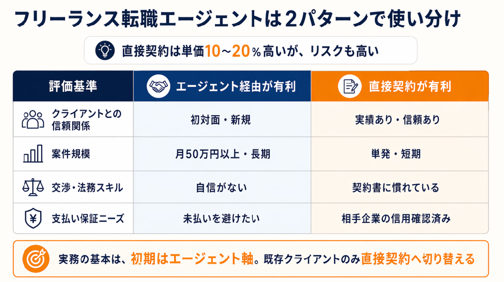 フリーランス歴3年未満の段階ではエージェント経由を軸にして、既存クライアントとの関係が深まった案件だけ直接契約に切り替えるハイブリッド運用が現実的です。