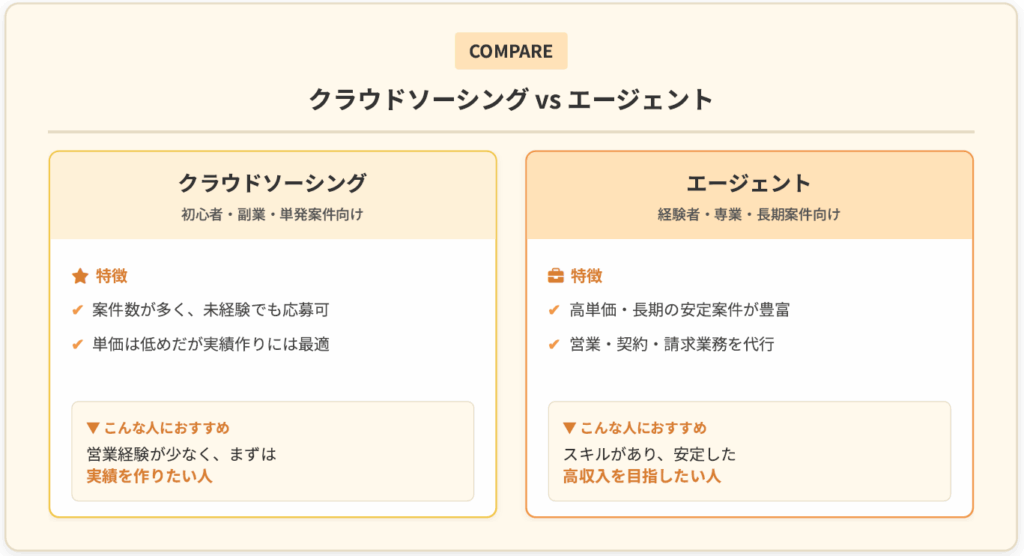 フリーランスとして案件を獲得するための営業活動には、「クラウドソーシング」と「エージェント」という二つの代表的な手段があります。それぞれに向いている人や活用ポイントが異なるため、自分に合った使い方を知っておくことが重要です。