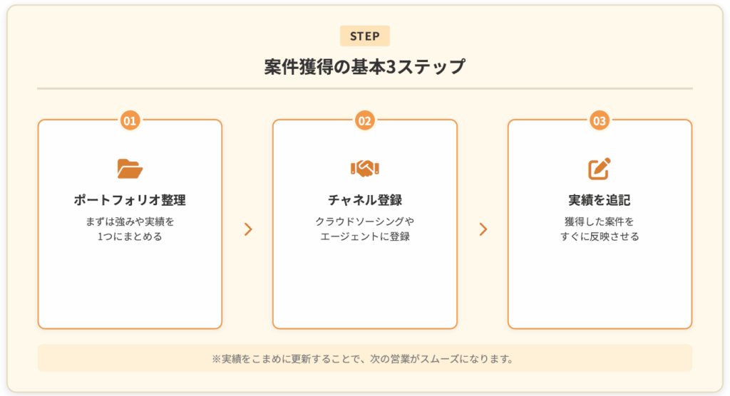 無事に案件を獲得したら、その実績をポートフォリオに追加しましょう。実績を積み重ねることで、次の営業がスムーズになり、より良い案件獲得につながります。