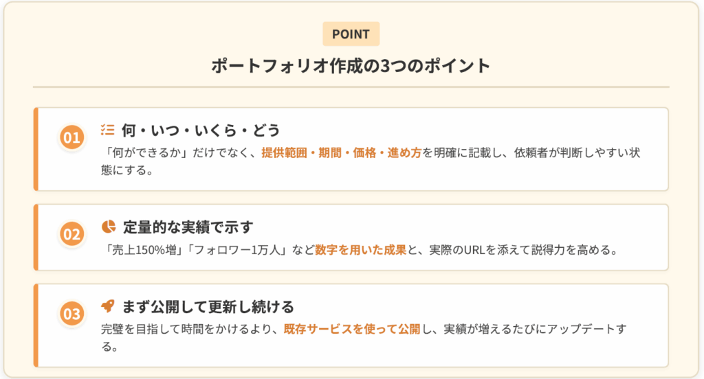ポートフォリオには、単なる自己紹介以上の情報が求められます。自分が「何ができるのか」を具体的に示すだけでなく、「どのくらいのスピードやコスト感で提供できるのか」まで明確に伝えましょう。