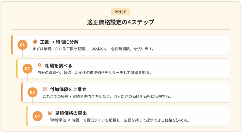 まず、自身のスキルや経験を棚卸して価格相場を知ることと、目標とする月収や稼働可能な時間から、最低限必要な単価を計算して知っておきましょう。そのうえで以下のステップで適正価格を算出します。