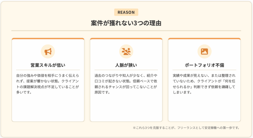 営業スキルが低い・人脈が狭い・ポートフォリオがないが主な理由
