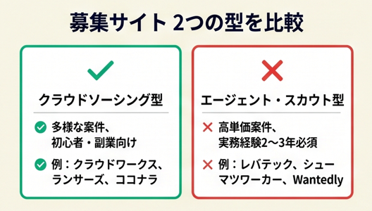 フリーランス募集サイトは大きく「クラウドソーシング型」と「エージェント・スカウト型」に分かれます。前者は自分で案件に応募し、後者は担当者やアルゴリズムが案件を紹介します。手数料体系も異なるため、稼ぎ方の戦略に合わせて選ぶことが重要です。