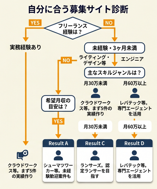 フリーランス募集サイトは「初心者期はクラウドソーシング型で実績を積み、経験を積んだらエージェント型や専門特化型へ移行する」2段階戦略が効率的です。手数料の低さだけで判断すると、案件が取れずに終わるリスクがあります。サイトの仮払い制度・評価システム・ジャンル特性を組み合わせて選ぶことが、継続的な収入につながります。